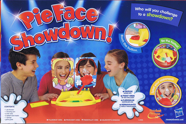 Two players sit facing each other with their chins on stands. Each person mashes their buttons as fast as possible, trying to make the mechanical hand smack whipped cream into their opponent’s face. Whoever has the best reflexes stays clean; the other walks away sticky and humiliated.